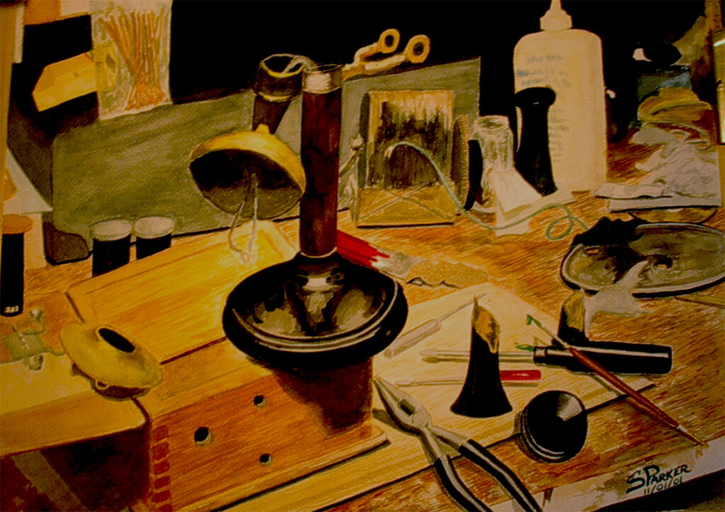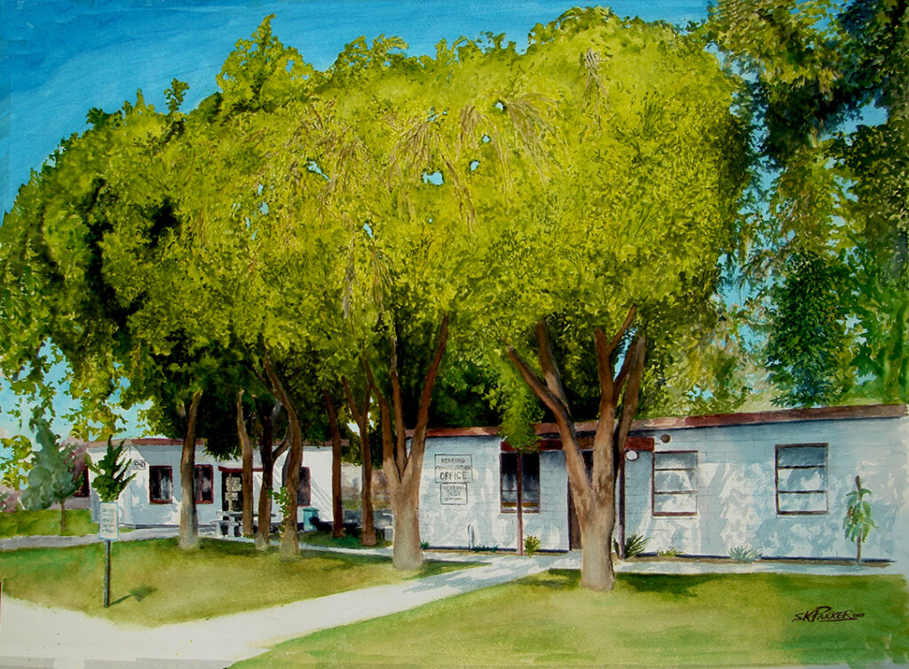 This watercolor painting by SKParker, completed in 2007, represents a unique artistic challenge. The artist deliberately selected a less attractive building from several digital photos, aiming to transform it through art. The goal was to infuse the scene with a spiritual ambiance; Thus, conveying a message of goodness and fondness. The result is a compelling piece that invites viewers to see a moment in time that brought others a sense of serenity and a positive calmness, This was voted “People’s Choice Award” when it was on display and was sold at that event. Giclee copies are available.